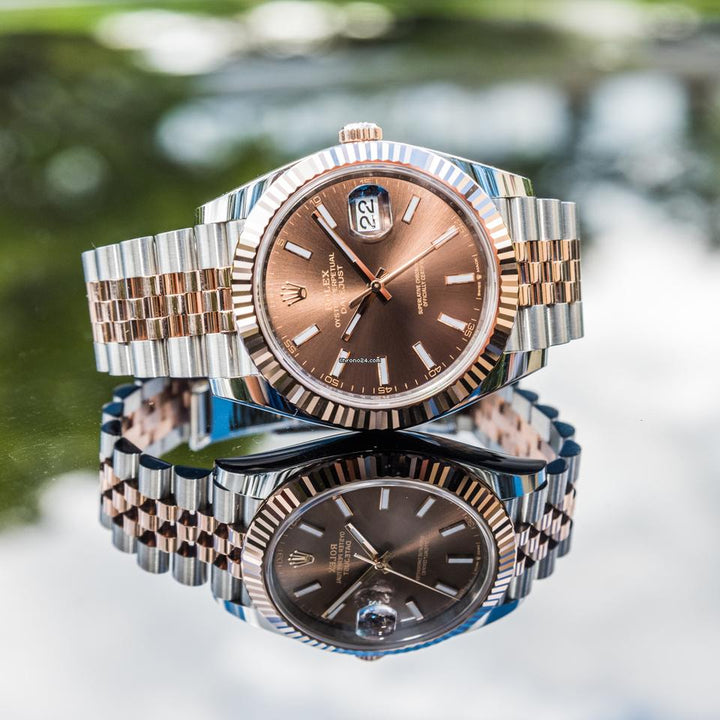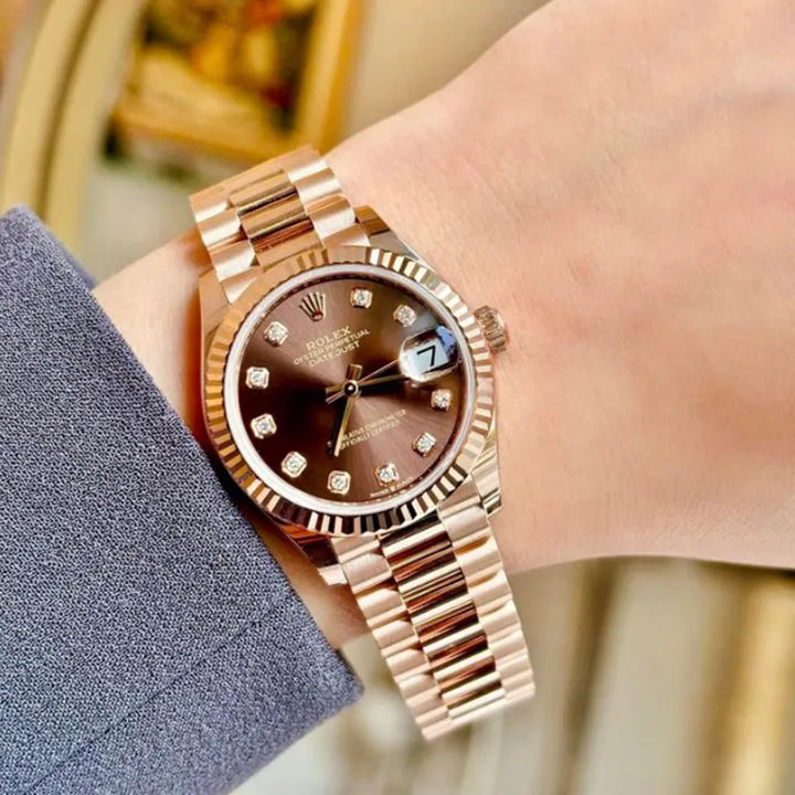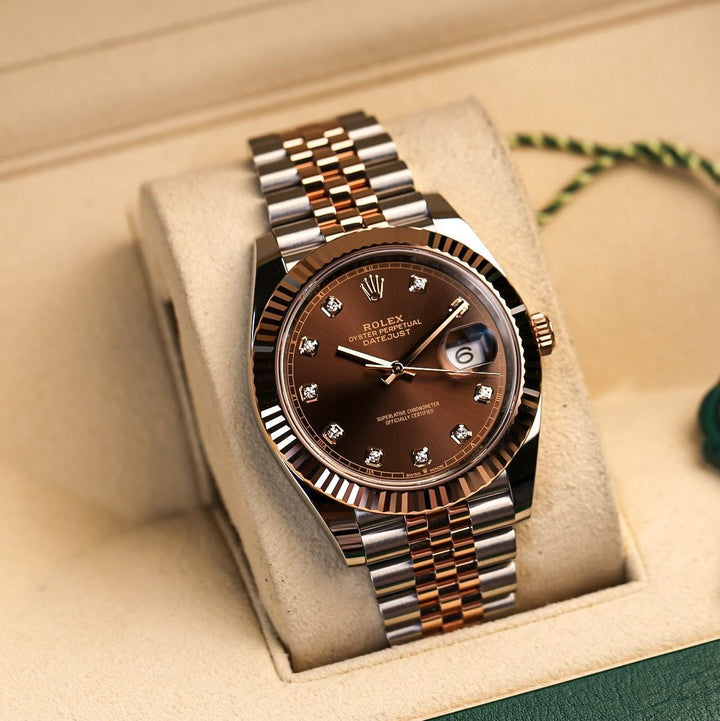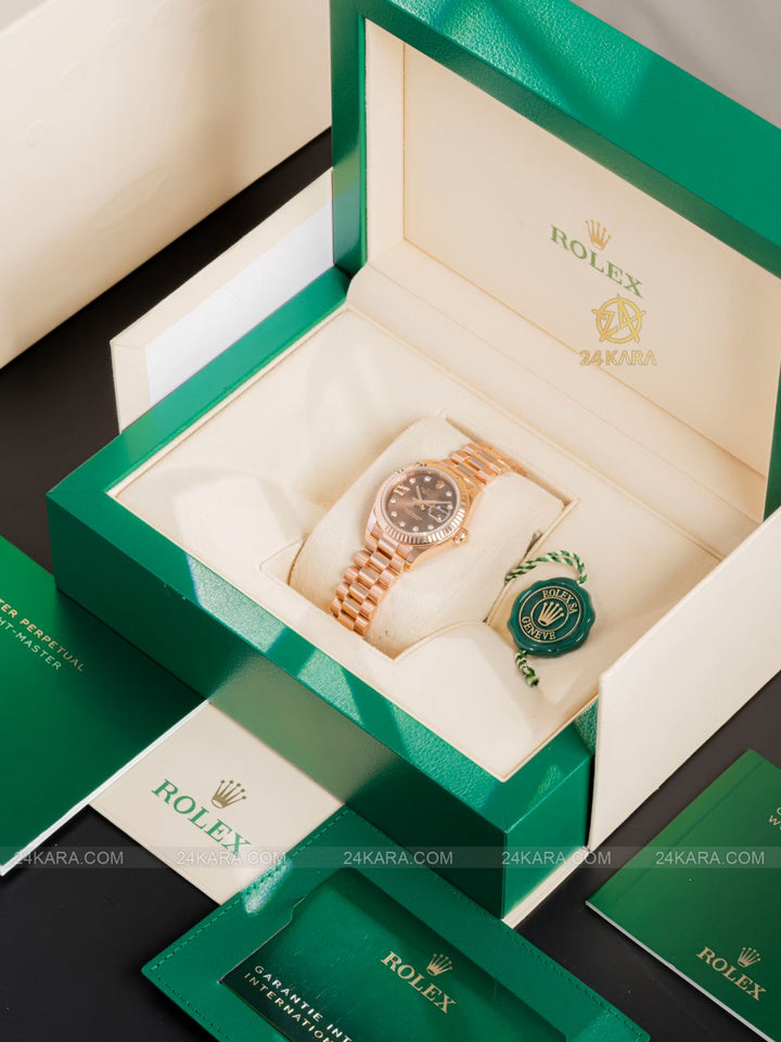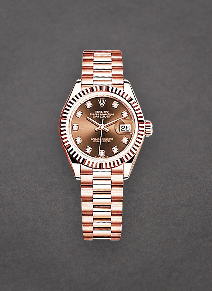 Unworn Rolex Lady-Datejust 279135rbr-0001. 28 mm. Chocolate Star Diamond Dial. Set with diamonds Bezel. Scratch-resistant sapphire, Cyclops lens over the date Crystal. Everose gold Case. 2236 Calibre. Perpetual, mechanical, self-winding Movement. 55 hours Power reserve. Everose gold bracelet with Concealed folding Crownclasp. 100 metres / 330 feet Water resistance.